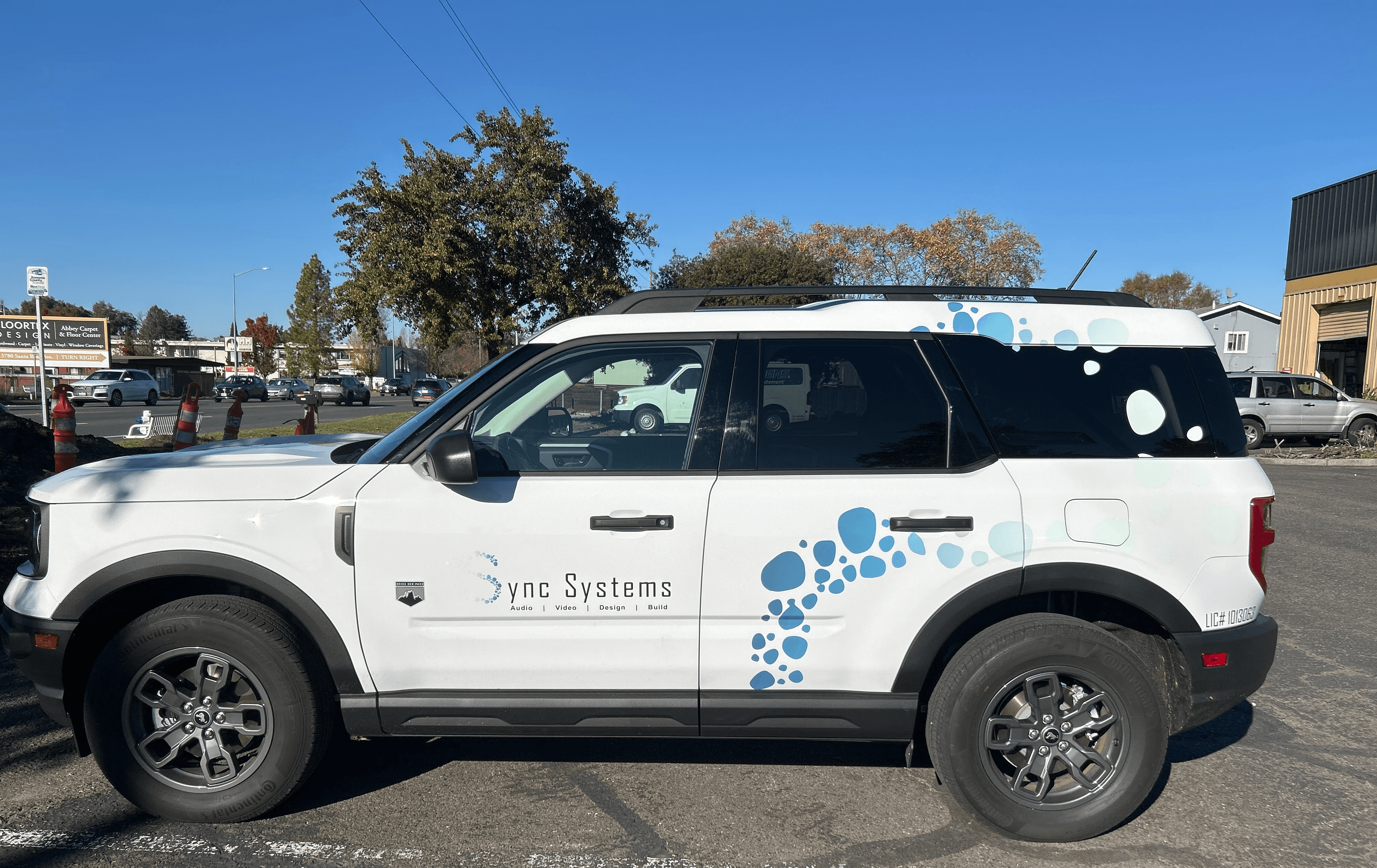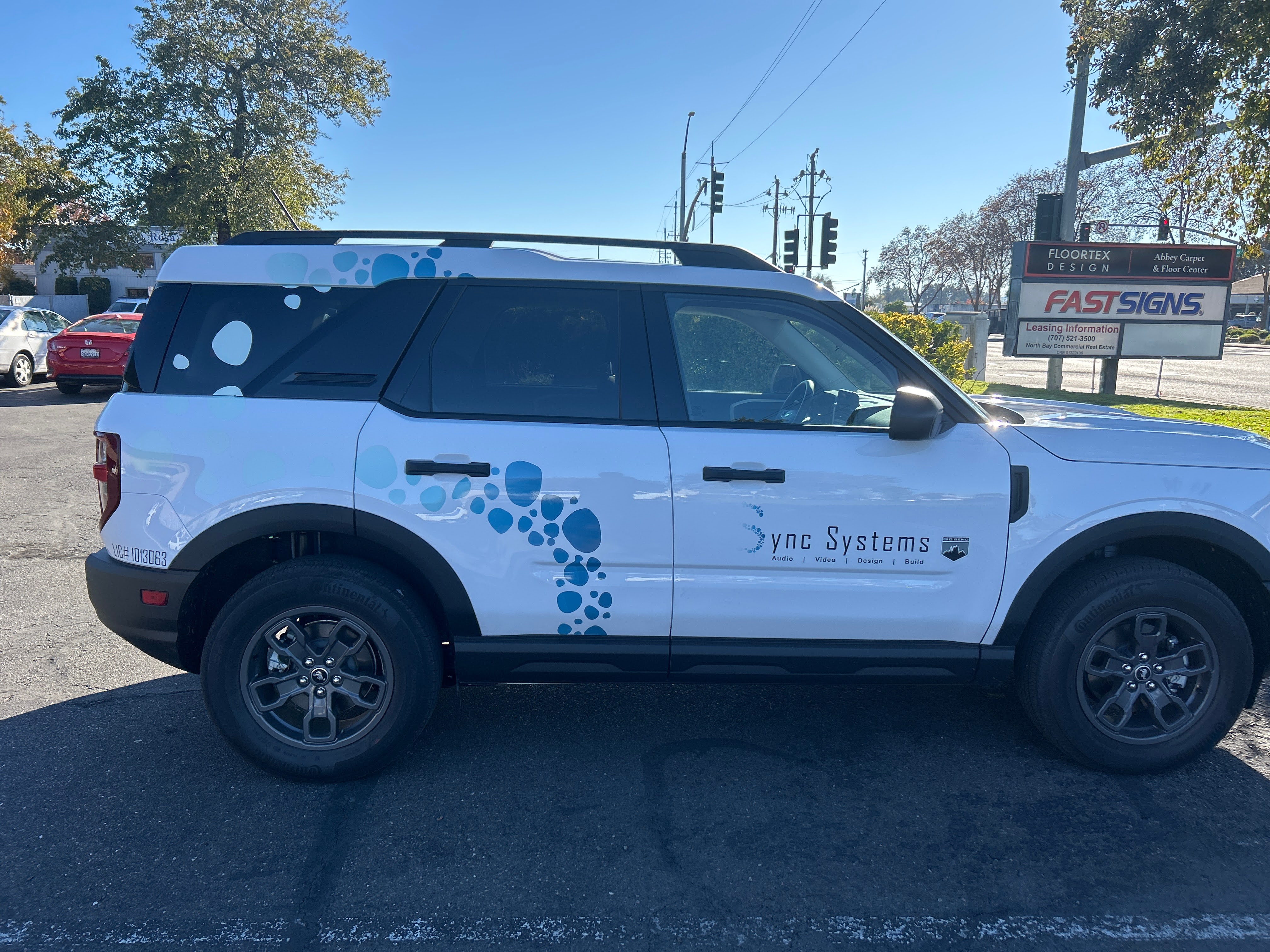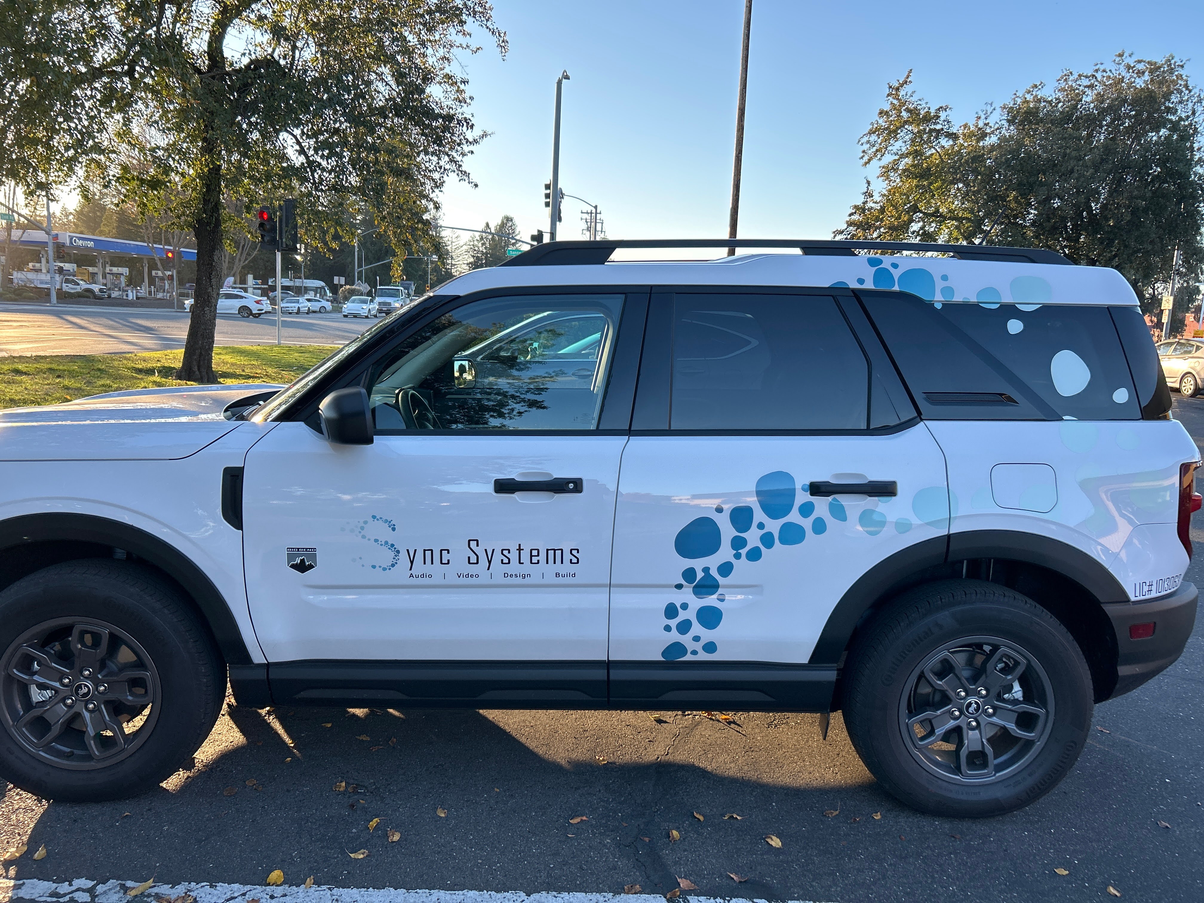 Sync Systems, an established audio-video and smart-home integration company based in Northern California. Requested a design for a full vehicle wrap for their new 2024 Ford Bronco Sport. Their goal was simple but challenging: